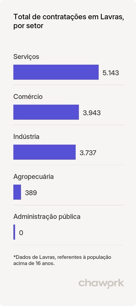 Sua organização em Lavras, MG tem chance de estar ignorando os talentos certos por ainda não conhecer nossa assessoria de recrutamento. Em Lavras, 13.212 lavrenses já foram admitidos, provando o grande volume de candidatos na área, e seu negócio deve se beneficiar ao se vincular com esses talentos experientes.